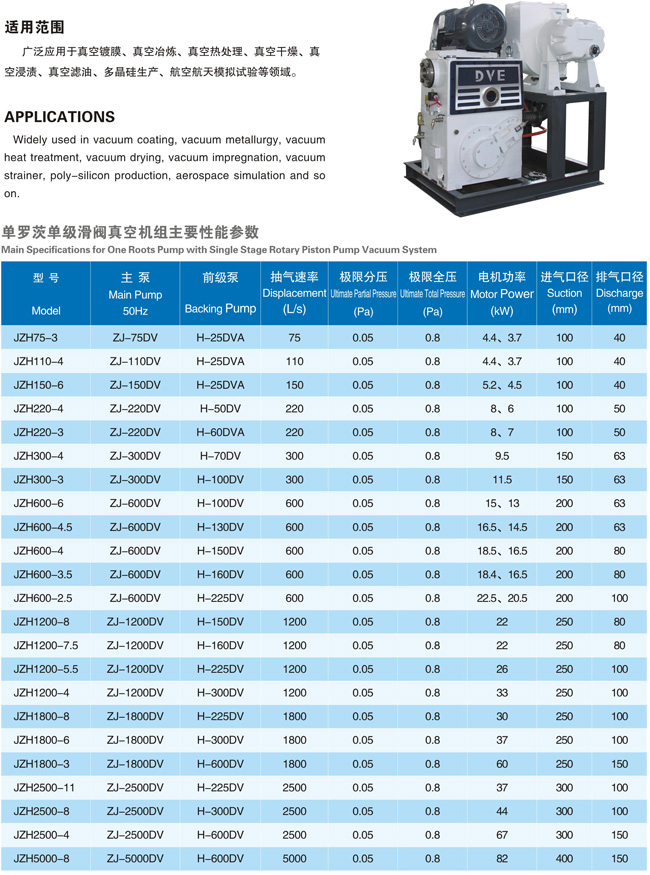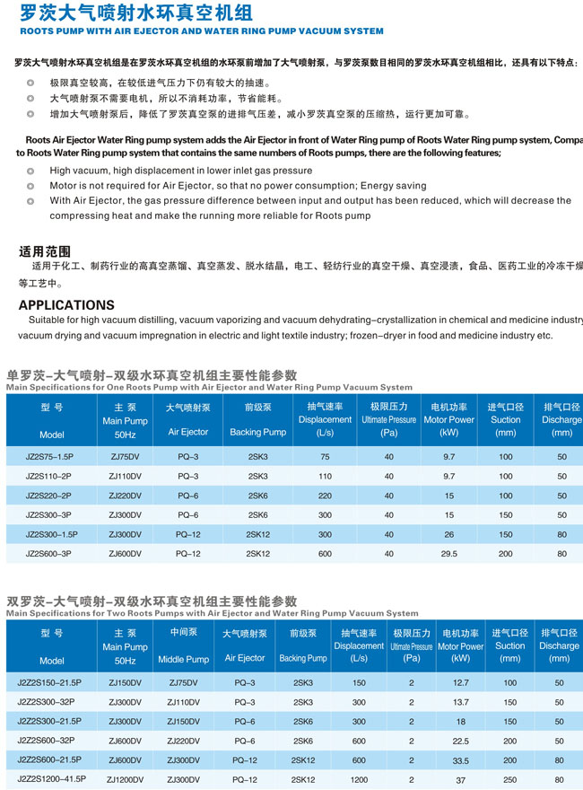 此機組主要用于需要處理大量水蒸汽,且極限真空度要求較高的抽真空系統(tǒng),例如在真空干燥方面。要求處理大量水蒸汽的真空系統(tǒng)中,使用水環(huán)泵是較合適的,但由于其極限真空度不高,致使整個機組的極限真空度較低。雖然在要求真空度較高的抽真空系統(tǒng)中,需要極限真空較高的機械真空泵作為前級泵使用。但由于水環(huán)泵的耗電量大,效率很低,噪聲高,在需要長時間的真空干燥系統(tǒng)中,用水環(huán)泵作為羅茨泵前級泵很不經(jīng)濟。